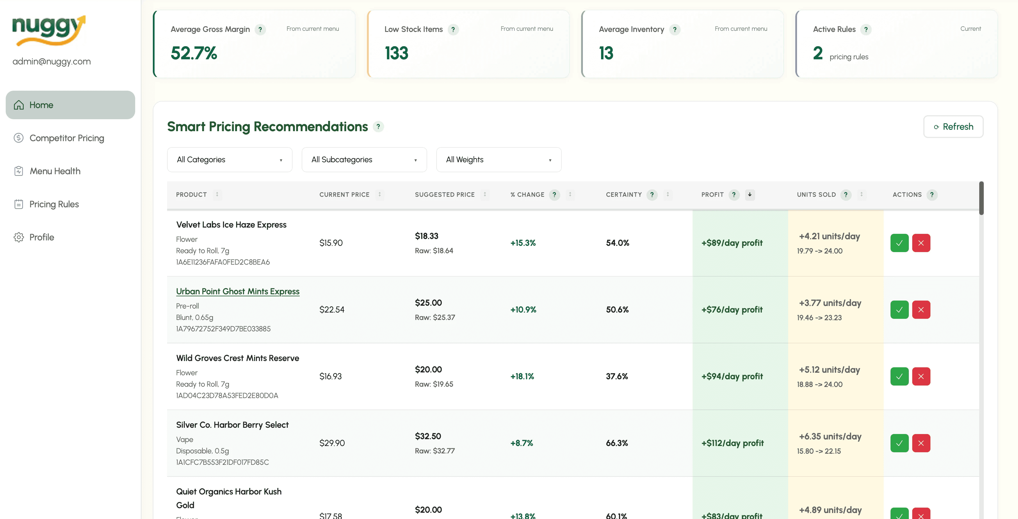 Nuggy analyzes your sales velocity, inventory levels, local competitors, weather, nearby events, and more to generate optimized pricing suggestions that help maximize revenue while maintaining healthy margins.